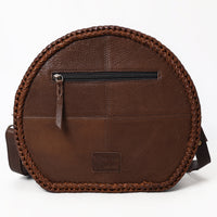 A bag that feels like the open West. This handcrafted round leather Canteen showcases a stunning etched desert landscape featuring towering cacti, prickly pears, desert palms, sun rays, and distant mesas. The monochrome artwork is hand-drawn into natural cowhide, framed with braided brown leather edges, and paired with a rustic adjustable strap.