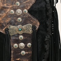 Make a bold Western statement with this handcrafted black fringe crossbody bag. Featuring a rugged distressed leather flap with intricate silver conchos, braided edges, and a brass-toned Western centerpiece, this bag embodies untamed cowgirl spirit and frontier fashion.