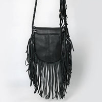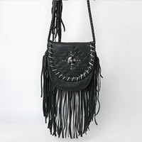 ADBGM635 Western Fringe Crossbody - Black Leather Bag with Tribal Stitch, Concho, and Whipstitch Detail