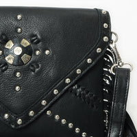 Premium Authentic Full Grain Genuine Leather. Luxuriously soft and pliable, this leather ages gracefully with wear, showcasing its enduring beauty.The flap is heavily decorated with silver-toned hardware, including a large, central square concho with a floral design, four smaller round conchos, and numerous small studs.