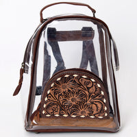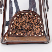 Stay stylish and compliant with this Western-inspired Clear Backpack featuring a transparent body and a beautifully hand-tooled leather front pocket. Designed for rodeos, concerts, stadiums, and festivals, this clear bag meets most event regulations while standing out with its unique cowboy flair.