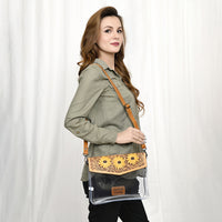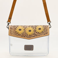 Make a stylish statement at your next game or concert with this stadium-approved clear crossbody bag. Featuring a hand-tooled leather flap with beautifully painted turquoise and white floral designs, this bag blends functionality with true Western artistry.