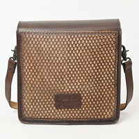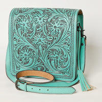 Make a bold Western statement with this structured square-shaped hand-tooled leather Crossbody bag. Expertly crafted from full-grain leather, this piece features a rich floral tooling design and crisp white whipstitch accents that add a striking edge. With a secure flap closure and strap, it's both stylish and practical for everyday use or rodeo nights.
