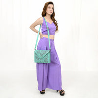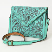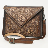 Timeless craftsmanship meets Western elegance in this envelope-style hand-tooled leather Wallet bag. Made from full-grain leather, it showcases intricate floral tooling on both the flap and body. The pointed envelope flap is accented with whipstitch edging for added charm, while the adjustable strap ensures everyday comfort.