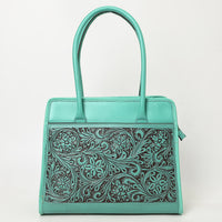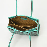 ADBGZ782 Structured Turquoise Leather Tote Handbag - Hand-Tooled Floral Western Panel