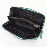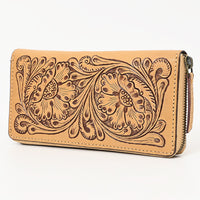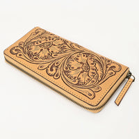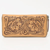 Carry Western elegance in the palm of your hand with this artisan-crafted leather wallet. Made from 100% genuine leather and meticulously hand-tooled, this piece features a bold floral scroll pattern that embodies classic Western style. Its compact yet functional design includes a secure zip-around closure and interior compartments perfect for cards, cash, and essentials. The natural tan finish offers a timeless, versatile look for everyday use.