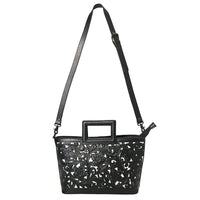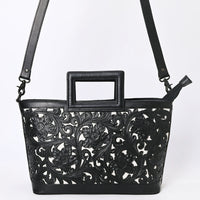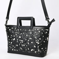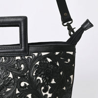 ADBGZ835A Black & White Hand-Tooled Leather Western Tote Handbag Cutout Handle & Floral Overlay