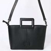 Refined Western artistry meets modern design in this stunning black and white leather Tote handbag. The bold floral tooling overlay adds dimension and elegance to a creamy white base, framed with a structured square cutout handle and a detachable shoulder strap. A versatile favorite for any Western fashionista looking to elevate her wardrobe.