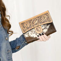 Celebrate true Western spirit with this handcrafted Leather & Cowhide Wallet Clutch by American Darling. Made from premium genuine leather and accented with natural hair-on hide, this piece features hand-tooled floral patterns that bring timeless Western elegance to everyday use.