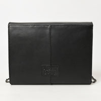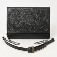 Make a bold yet refined statement with this black tooled leather Crossbody bag by American Darling. Featuring masterfully hand-tooled floral leatherwork, the bag combines tradition and sophistication with its sleek silhouette and a fusion of chain and buckle strap detailing. The perfect companion for both Western glam and city chic looks.