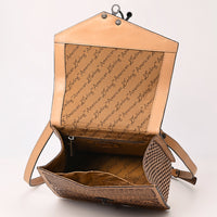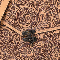 Make a bold statement with this structured, tooled leather handbag from American Darling. Crafted from premium vegetable-tanned leather and hand-tooled with an intricate floral and basketweave design, this satchel-style bag features a sturdy top handle and shoulder strap. Whether carried by hand or worn crossbody, this timeless Western piece blends elegance with practicality.