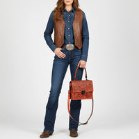 Bright, bold, and beautifully Western — this orange tooled leather tote handbag by American Darling is a true showstopper. Featuring full floral and basketweave hand-tooling on premium leather, this structured satchel-style bag includes both a sturdy top handle and a detachable crossbody strap. A striking piece for fashion-forward cowgirls who want to stand out at rodeos, festivals, or everyday adventures.