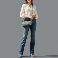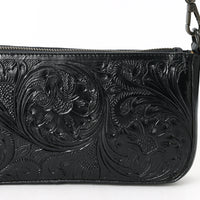 Effortlessly sleek and Western-chic, this black hand-tooled crossbody bag is your go-to for nights out or statement-making daytime looks. Made from premium full-grain leather, it features detailed floral tooling across the front and back, adding rich texture and sophistication. The leather-woven chain strap adds a modern edge while maintaining the rustic charm of traditional craftsmanship.