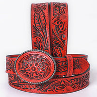 ADBL168 Red Floral Hand-Tooled Leather Belt with Western Oval Buckle