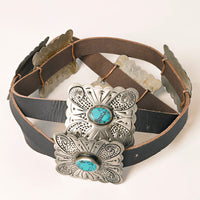 Channel authentic Southwestern charm with this stunning concho belt, featuring bold square silver conchos intricately engraved and inlaid with genuine turquoise stones. The full-grain black leather strap offers a durable and rustic base, while the scalloped-edge conchos add dramatic Western flair. Whether paired with denim, dresses, or layered over skirts, this belt makes a powerful style statement rooted in cowboy tradition.