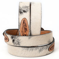 ADBLF202 White Hair-On Cowhide Belt with Floral Tooled Leather Inlays and Western Buckle