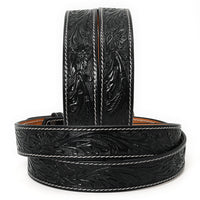 Elevate your look with this bold black leather belt, featuring exquisite hand-tooled floral patterns and a matching tooled leather buckle. Designed for durability and sophistication, this belt adds refined Western charm to both everyday wear and formal outfits. Finished with contrast stitching for a clean, structured edge.