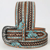 ADBLF221 Turquoise Rodeo Cowboy Hand-Tooled Leather Belt with Silver Buckle