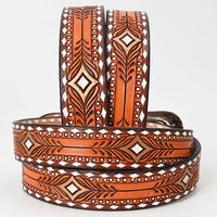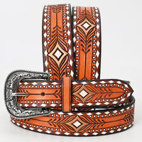 ADBLF247 Geometric Tooled Leather Western Belt with Whipstitch Edge and Engraved Buckle