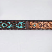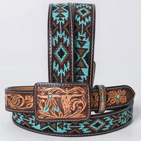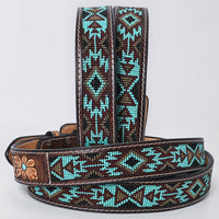 Celebrate Western heritage and tribal artistry with this Turquoise Beaded Navajo Western Belt. The belt features intricate hand-beaded patterns in turquoise, brown, and black, inspired by traditional Navajo motifs. Rich brown leather borders the beadwork, accented with hand-tooled floral designs and turquoise rivet details. The matching buckle showcases a bold tooled bull skull with feather details, creating a cohesive look full of Southwestern soul. Whether for rodeos, festivals, or everyday Western flair, this belt is a true statement of craftsmanship.
