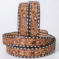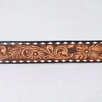 Channel the timeless beauty of Western craftsmanship with this hand-tooled leather belt, richly carved in classic floral scrolls. The deeply tooled patterns feature vintage-styled flowers with turquoise stud centers, set against a rich two-tone brown finish. A white diamond-laced border adds high-contrast framing, while the large matching tooled buckle ties the whole design together. This piece is perfect for rodeo wear, rustic fashion, or premium boutique styling.