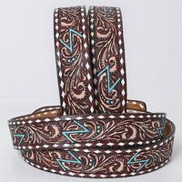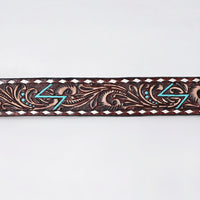 ADBLF288 Tooled Western Leather Belt - Turquoise Lightning Bolt & Floral Scroll Design