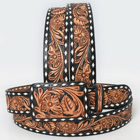 ADBLF290 Black & Saddle Hand Tooled Leather Western Belt - Floral Vine Design