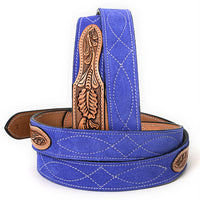 Elevate your Western wardrobe with this standout belt featuring finely tooled tan leather accented by a vibrant royal blue Genuine suede back. The detailed floral carving on the front is paired with contrast stitching and a silver antique-finish Western buckle, creating a stylish balance of rugged tradition and bold flair.
