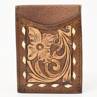 ADCCG102 Brown Hand-Tooled Leather Card Wallet - Vertical Floral Design with Diamond Accents