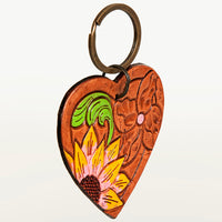 ADKR183 Hand-Tooled Leather Heart Keyring Western Floral Design with Pink Accents