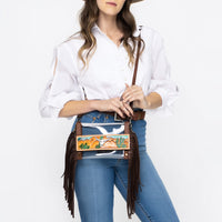 Carry a piece of the vast American landscape with this striking clear bag from American Darling. Handcrafted from durable, transparent material, this crossbody is framed by rich genuine leather and features a unique, hand-painted leather panel showcasing an authentic scene complete, mountains, and a steer skull. The sides are accented with dramatic, long leather fringe, adding dynamic movement and rugged Western character.