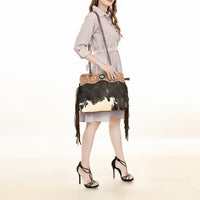 Built for the cowgirl who carries it all, this bag is both spacious and functional. Dramatic, long leather fringe flows from the sides, adding dynamic movement. The main compartment offers ample storage, secured by a reliable zipper closure. Measuring 12.5in (H) X 14in (W) X 3in (D), this generous size ensures you have room for all your essentials, making it the perfect blend of luxury, heritage, and utility.