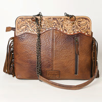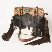 Make a bold statement with this luxurious, handcrafted crossbody bag from American Darling. The front panel features striking hair-on cowhide, contrasted by a top yoke of natural, hand-tooled floral carved leather centered around a beautiful accent stone. The design is further elevated by two heavy gunmetal chain accents that drape over the cowhide, fusing rugged Western texture with high-end, urban style.
