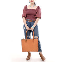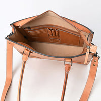 Elegance meets everyday functionality in this timeless Western tote. Crafted from genuine vegetable-tanned leather in a natural tan finish, this structured handbag offers a minimalist yet rugged charm. Whether you're heading to the office or the ranch, this bag transitions effortlessly with its top handles and removable shoulder strap.