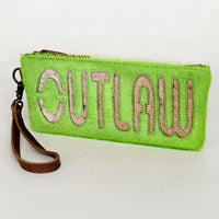 Turn heads with this bold and playful “RODEO” wristlet clutch, crafted from hair-on-hide leather. The front panel features laser-cut lettering that reveals a contrasting natural hide underneath, giving the bag a layered and dynamic Western look. Finished with a sturdy zip-top closure and detachable brown leather wrist strap, this accessory is perfect for rodeo nights, concerts, or any cowgirl outfit that needs a pop of fun and flair.