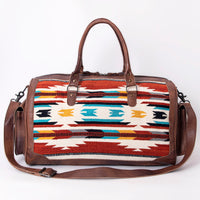 Travel in timeless Western style with the Tooled Leather & Saddle Blanket Duffel Bag by American Darling. This handcrafted masterpiece combines luxurious full grain leather with a vibrant, handwoven wool saddle blanket, accented by Southwestern geometric motifs.