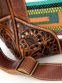 Travel in timeless Western style with the Tooled Leather & Saddle Blanket Duffel Bag by American Darling. This handcrafted masterpiece combines luxurious full grain leather with a vibrant, handwoven wool saddle blanket in a bold yellow backdrop, accented by Southwestern geometric motifs in red, turquoise, and navy.