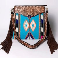 LC-ADBGA120 Turquoise Southwestern Wool Crossbody with Tooled Leather Yoke & Fringe Western Artisan Shoulder Bag