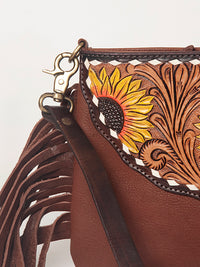 Celebrate the warmth of western sunshine with this radiant crossbody bag. Made from supple brown leather, the bag is crowned with a vibrant hand-tooled and hand-painted sunflower yoke. The intricate floral carving is paired with playful long fringe on both sides and a matching adjustable strap. Whether you're headed to a rodeo or running errands, this artisan-crafted bag brings bold charm and feminine strength to every step.