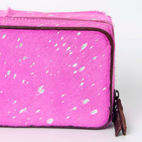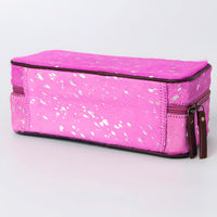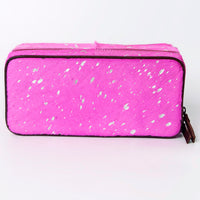 Make a bold statement with this eye-catching jewelry case, perfect for organizing and protecting your precious accessories at home or on the go. The exterior features genuine cowhide leather dyed a vibrant magenta/fuchsia color, which is then accented with a trendy metallic silver splatter print. The rectangular, boxy shape offers ample storage space, while the dark leather piping and trim provide a striking contrast and enhance the case's durability. It secures with a wrap-around zipper, complete with a dark leather pull, ensuring your contents stay safe. This unique case is a fashionable blend of rustic texture and modern, electric style.br />