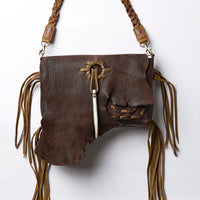 LC-ADBGM254 Raw-Edge Leather Western Crossbody Bag - Fringe Saddle Purse with Horn Toggle & Braided Strap