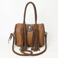 A standout turquoise concho framed in tooled leather draws the eye, while long fringe tassels give it authentic cowgirl attitude.