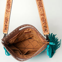 The shoulder strap is adjustable and made of 100% genuine vegetable tanned Cowhide Leather with a hand tooled pattern.