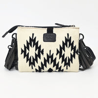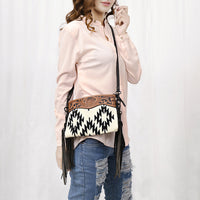 LC-ADBGZ183H Black & White Tribal Wool Crossbody Bag with Tooled Leather and Fringe - Western Purse