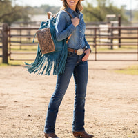 Elevate your Western wardrobe with this stunning teal leather fringe backpack—an artisan-crafted piece that blends function with statement style. The supple teal leather body is accented by a beautifully hand-tooled floral leather front pocket, celebrating heritage craftsmanship with every detail. Long, flowing fringe adds a bold cowgirl flair, while the drawstring closure and straps make it perfect for everyday adventure or rodeo weekend.