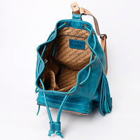 LC-ADBGZ741 Teal Hand Tooled Leather Fringe Backpack - Western Cowgirl Drawstring Bag