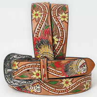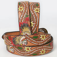 LC-ADBLF168 Handtooled Leather Belt - Warrior Skull Headdress & Western Floral Accents