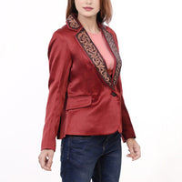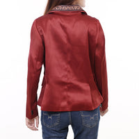 Make a bold Western statement with this vibrant red satin blazer featuring luxurious hand-tooled leather lapels. Designed for the stylish cowgirl who loves to stand out, this tailored piece blends rich color with traditional craftsmanship in a modern silhouette.