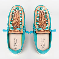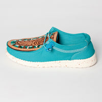 Step into the spirit of the West with these vibrant turquoise canvas loafers by American Darling. Featuring genuine hand-tooled leather tops with intricate floral and feather designs, accented by a stunning turquoise inlay border, these shoes are where comfort meets craftsmanship.