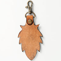 Turn heads with this bold and artistic tooled leather keyring featuring a skull motif adorned with colorful hand-painted flowers. Crafted in a maple leaf-shaped silhouette, this Western-style accessory comes with a sturdy antique brass swivel clip, perfect for bags, keyrings, or belt loops.